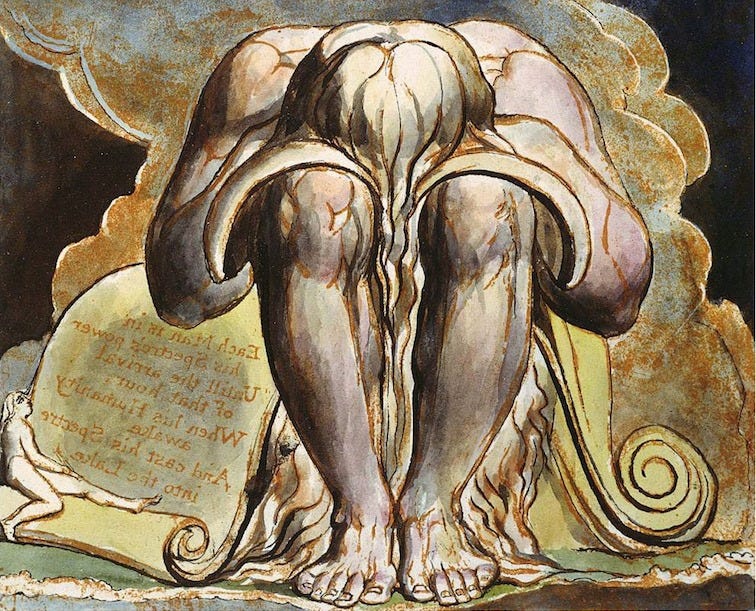 Blake’s fear of single vision and Newton’s sleep reads like an early diagnosis of reality drift. A slow collapse of fidelity where abstraction crowds out lived meaning. When imagination is subordinated to certainty, cultures lose the shared perceptual depth that lets people recognize one another as inhabiting the same world. Albion’s sickness feels less like moral failure than a breakdown in compression. Too much explanation, not enough vision, and a thinning of what reality can hold.